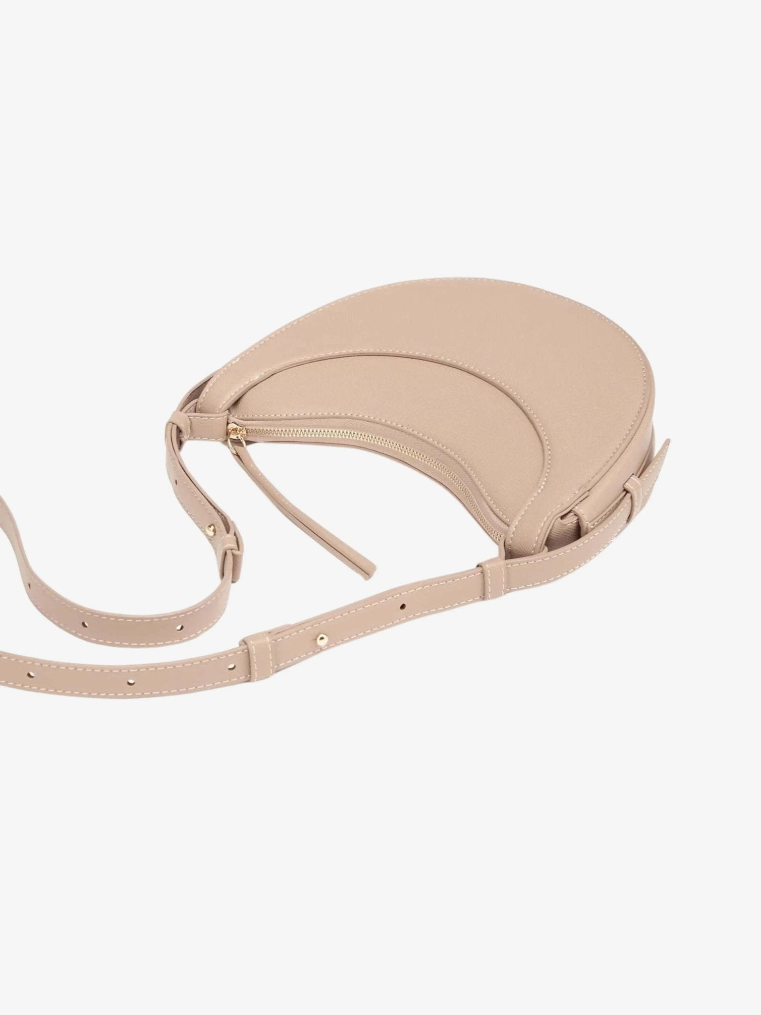 • Design: Sleek half-moon silhouette with visible stitching and front curved panel